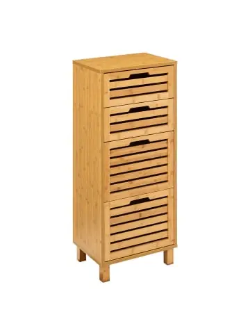 Stehender hoher Badezimmerschrank SICELA mit 4 Schubladen – praktisch und stilvoll Stehender hoher Badezimmerschrank SICELA mit 4 Schubladen: Dieser Schrank bietet Ihnen viel Stauraum für Ihre Badezimmerutensilien und sorgt gleichzeitig für eine stilvolle Atmosphäre in Ihrem Badezimmer.Abmessungen: Der Schrank hat eine Größe von 40 x 30 x 97,5 cm und passt somit perfekt in Ihr Badezimmer. Die kompakte Größe ermöglicht es Ihnen, den Schrank auch in kleinen Räumen zu platzieren.Stilvolles Design: Der Schrank ist in einem eleganten Braunton gehalten, der Ihrem Badezimmer einen natürlichen und warmen Look verleiht. Das dominierende Material, Bambus, verleiht dem Schrank zudem eine hochwertige Optik.Praktische Schubladen: Der Schrank verfügt über 4 geräumige Schubladen, in denen Sie Ihre Badezimmerutensilien ordentlich und griffbereit aufbewahren können. Die Schubladen sind leicht zu öffnen und schließen und bieten ausreichend Platz für Handtücher, Kosmetik und andere Gegenstände.Einfache Montage: Der Schrank wird zerlegt geliefert, ist aber dank der mitgelieferten Anleitung und des einfachen Montagesystems leicht zusammenzubauen. Sie können den Schrank schnell und unkompliziert aufstellen und sofort von seinem praktischen Nutzen profitieren. Die Struktur des Schranks besteht aus Spanplatten. Die Rückseite des Schranks besteht aus MDF-Faserplatte. Die Beine und Türen bestehen aus FSC-zertifiziertem Bambus.Dieses Produkt darf sicher und in der vom Hersteller vorgesehenen Weise verwendet werden und ausschließlich gemäß den Anweisungen, Empfehlungen, Warnungen oder Sicherheitsinformationen, die auf dem Produkt oder seiner Verpackung angebracht oder beigefügt sind.