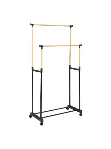 Kleiderständer mit Rollen und doppelten Stangen zur Aufbewahrung – praktische Lösung zur Organisation von Kleidung in Ihrem ZuhausePraktische Aufbewahrungslösung: Der WOODY Kleiderständer mit den Maßen 86 x 42 x 165 cm ist die ideale Lösung für Personen, die zusätzlichen Stauraum für Kleidung suchen. Dank der doppelten Stangen können Sie Ihre Kleidung mühelos organisieren, was die täglichen Stilentscheidungen erleichtert. Robuste Konstruktion: Hergestellt aus hochwertigem Edelstahl und Kunststoff, bietet der Ständer Stabilität und Langlebigkeit. Eine maximale Belastung von 20 kg sorgt dafür, dass er stark genug ist, um all Ihre Lieblingskleidungsstücke zu halten. Mobilität und Komfort: Ausgestattet mit vier Rollen, darunter zwei mit Bremssystem, kann der Ständer leicht an jeden Ort im Haus bewegt werden. Dies ist eine hervorragende Lösung für Personen, die Flexibilität bei der Raumorganisation schätzen. Funktionalität für den Alltag: Zwei Kleiderstangen mit einer Länge von jeweils 85 cm ermöglichen das Aufhängen verschiedener Arten von Kleidung, von Hemden bis Mänteln. Ein zusätzlicher Ablageboden unten ermöglicht die Aufbewahrung von Accessoires oder Schuhen, was die Funktionalität des gesamten Produkts erhöht. Einfache Montage und Nutzung: Der WOODY Kleiderständer ist einfach zu montieren und erfordert keine komplizierten Werkzeuge. Dank des intuitiven Designs gewinnen Sie schnell zusätzlichen Platz für Kleidung, was Ihren Raum ordentlicher macht.