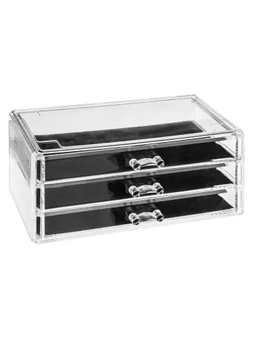 Schmuckschatulle mit 3 Schubladen, Größe L, transparent Wertvoller Schmuck sollte nicht an zufälligen Stellen aufbewahrt werden, an denen er verloren gehen oder beschädigt werden kann. Es lohnt sich, sich mit einem passenden Organizer auszurüsten, der Sicherheit garantiert und dafür sorgt, dass Sie nie vergessen, wo Sie Ihre Lieblingsarmbänder wieder versteckt haben. Die einzigartige Schmuckbox dient auch als dekorative Funktion Ihres Schlafzimmers oder Garderobe. Die 5five Simple Smart Schmuckbox verfügt über drei Schubladen für Ketten, Armbänder, Ohrringe und Ringe. Dies ermöglicht es Ihnen, Silber von Gold oder Anhänger von Ohrringen zu trennen. Die Box ist aus hochwertigem Kunststoff, der volle Transparenz hat, so dass Sie alle Inhalte ohne Öffnen sehen können. Die Abmessungen der Box sind 24 x 15 x 7 cm, wodurch sie in eine Schublade, auf einem kleinen Regal in einem Schrank oder auf einer Schminktischplatte passt. Die Aufbewahrung Ihres Schmucks kann sehr einfach sein, und Ihre Schmuckschatulle kann zu einer ungewöhnlichen Dekoration für Ihr Interieur werden. Produkteigenschaften: Schmuckschatulle mit drei Schubladen,das Zubehör schützt den Schmuck vor Beschädigung oder Verlust,die Box hält Ketten, Ohrringe, Ringe oder Armbänder,dieBox ist aus Kunststoff,transparent. Ermöglicht Ihnen, den Inhalt ohne Öffnen zu verdächtigen,dieMaße der Box sind 24 x 15 x 7 Zentimeter,dasProdukt der bekannten Marke 5five Simple Smart.