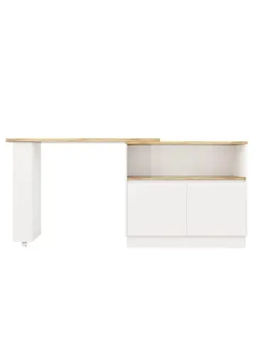 Produktmerkmale:360°-Drehfunktion: Flexibles Rotationdesign für optimale Platzierung in verschiedenen Räumen. Ideal für offene Küchen oder als Stauraum im Esszimmer.Hochwertige Glasschiebetür: Halbtransparentes Glas schützt vor Staub und verbirgt Gegenstände, während es Ästhetik und Privatsphäre bewahrt.Großzügiger Stauraum: Enthält offene Regale, Schubladen und geschlossene Fächer zur organisierten Aufbewahrung von Wein, Geschirr, Gewürzen etc.Premium-Materialien: Umweltfreundliche MDF-Platte mit verschleißfester Arbeitsplatte in natürlicher Holzoptik. Langlebig, pflegeleicht und stabil.Modernes Design: Schlichter Stil in Weiß und Holzoptik passt zu modernen, rustikalen oder retro Einrichtungen. Vielseitig als Kücheninsel, Bar oder Vitrine einsetzbar.Spezifikationen:Abmessungen: Hauptkörper: 90×45×100 cm | Drehteil: 45×14,5×103 cm | Anschlussplatte: 120 cmGewicht: 45,85 kgMaterial: MDFMax. Belastung: 60 kgMontage: Erforderlich (ca. 30 Minuten)Lieferumfang: 2 Pakete (inkl. Montagematerial)Besonderheiten:Polierte Ecken mit abgerundetem Design für mehr Sicherheit.Hochwertige Metallgleitschienen für langlebigen und smooth Betrieb der Schiebetür.Vielseitig nutzbar als Küchenhelfer, Barregal, Vitrine oder Wohnzimmer-Organizer.