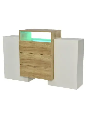 Futuristisches Design & stimmungsvolle Beleuchtung:Mehrfarbige RGB-LED-Lichtstreifen (einstellbar) schaffen individuelle Atmosphären.Kontrastreiches Design aus Hochglanzweiß und warmer Holzoptik.Einzigartige, skulpturale Form für einen modernen Blickfang.Praktischer & übersichtlicher Stauraum:Drei Schubladen für organisierte Aufbewahrung von Kleinteilen.Zwei Türen mit dahinterliegenden zwei festen Einlegeböden.Ein offenes Fach für schnellen Zugriff oder dekorative Präsentation.Robuste Qualität & optimale Maße:Stabile MDF-Konstruktion mit einer hohen Tragkraft von 80 kg.140 cm Breite bei nur 30 cm Tiefe – extrem schlank und raumsparend.Einfache Montage mit visueller Anleitung (ca. 30-60 Minuten).Perfekt für:Moderne, minimalistisch oder loft-artig eingerichtete Wohnzimmer, Essbereiche oder Flure.Alle, die eine Aufbewahrungslösung mit stylischem Lichtakzent suchen.Ein Sideboard, das durch sein kontrastreiches Design, integrierte RGB-Beleuchtung und schlanke Form besticht – für ein einzigartiges Wohnambiente.