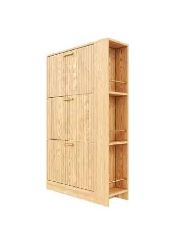Dieser schlanke Schuhschrank kombiniert minimalistisches Design mit praktischem Stauraum und sorgt für Ordnung im Eingangsbereich, Flur oder Schlafzimmer.Praktisches Staukonzept:Drei staubgeschützte Türen mit je zwei festen Einlegeböden – Platz für bis zu 12–18 Paar Schuhe.Offene Seitenfächer für schnellen Zugriff auf Schlüssel, Geldbörsen oder häufig getragene Schuhe.Stabile MDF-Konstruktion mit einer Tragkraft von 30 kg.Natürliches & zeitloses Design:Holzmaserungs-Optik verleiht dem Schrank eine warme, natürliche Anmutung.Schlanke Maße (nur 23,5 cm Tiefe) passen auch in schmale Flure oder Nischen.Passt ideal zu modernen, skandinavischen und urbanen Einrichtungsstilen.Alltagstauglich & langlebig:Feste Regalböden verhindern Durchbiegen und gewährleisten Stabilität.Einfache Montage in 40–120 Minuten, alle Werkzeuge inklusive.Leicht zu reinigende Oberfläche.Wichtiger Hinweis: Aufgrund der Naturholzdarstellung können leichte Farb- und Maserungsunterschiede zwischen Abbildung und Original auftreten – jedes Stück ist ein Unikat.Technische Details:Maße: 70 (B) x 23,5 (T) x 115 (H) cmMaterial: MDF mit Holzmaserungs-OptikFarbe: NaturGewicht: 22,1 kgLieferung: 1 PaketMit diesem Schuhschrank schaffen Sie eine aufgeräumte, stilvolle Eingangszone – wo Funktionalität auf schlichte Ästhetik trifft.
