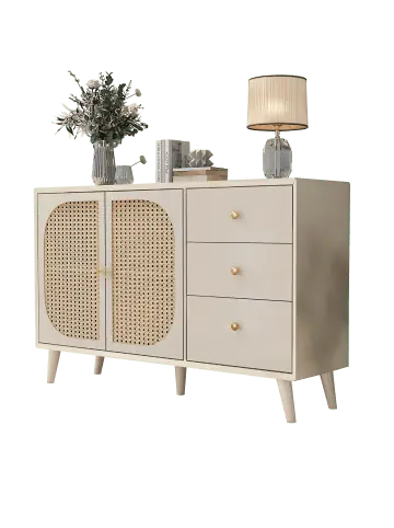 Natürliches Design & praktische Details:Zwei Türen mit Rattangewebe sorgen für eine luftige, textile Optik und Staubschutz.Drei geräumige Schubladen mit glatten Metallauszügen für übersichtliche Organisation.Massivholzbeine aus Kiefer verleihen Stabilität und einen natürlichen Akzent.Cremeweiße Oberfläche (E1-Spanplatte) schafft eine warme, gemütliche Atmosphäre.Intuitive Bedienung & robuste Qualität:Push-to-Open-Mechanismus – Türen öffnen sanft per leichten Druck.Magnetischer Türverschluss für sicheres Schließen.45-Grad-Eckverbindungen für eine saubere, stabile Konstruktion.Wasserdichte und pflegeleichte Oberflächen.Großzügiger Stauraum & optimale Maße:120 cm Breite bei nur 40 cm Tiefe – schlank und platzsparend.Fünf separate Stauräume (2 Fachbereiche + 3 Schubladen) für Geschirr, Bücher oder Haushaltsutensilien.Tragkraft von 50 kg.Vielseitige Nutzung:Ideal als Sideboard im Wohn- oder Esszimmer, als TV-Schrank oder Aufbewahrungsmöbel in Küche oder Flur.Passt zu modernen, skandinavischen und landhaus-inspirierten Einrichtungsstilen.Ein funktionales und stilvolles Möbelstück, das durch seine Kombination aus natürlichem Rattan, warmen Farbtönen und praktischem Stauraum überzeugt.