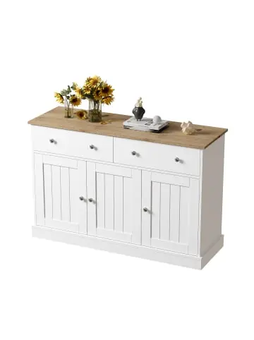 Strukturiertes Design & edle Details:Einzigartig geprägte Textur auf den Türen für eine moderne, taktile Optik.Warmes Farbspiel aus Holzoptik und reinem Weiß für einen hellen, freundlichen Look.Diskrete Push-to-Open-Mechanik (öffnet per Druck) für einen grifflosen, minimalistischen Eindruck.Silberne Griffe (vermutlich an Schubladen) setzen dezente Akzente.Praktischer & organisierter Stauraum:Drei Türen mit dahinterliegenden Fächern für größere Gegenstände.Zwei geräumige Schubladen für übersichtliche Aufbewahrung von Kleinteilen.Gedämpfte Scharniere für leises und sanftes Schließen.Robuste Qualität & optimale Maße:Stabile Spanplatten-Konstruktion mit einer Tragkraft von 35 kg.120 cm Breite bei nur 36 cm Tiefe – extrem schlank und platzsparend.Einfache Montage mit Anleitung, Lieferung in 2 Paketen.Vielseitige Nutzung:Ideal als schlankes Sideboard im Wohnzimmer oder Essbereich, als Aufbewahrungsschrank im Flur oder als funktionales Möbelstück im Home-Office.Passt zu modernen, minimalistischen und skandinavischen Einrichtungsstilen.Ein Sideboard, das durch seine strukturierte Oberfläche, die grifflose Eleganz und das platzsparende Design überzeugt.