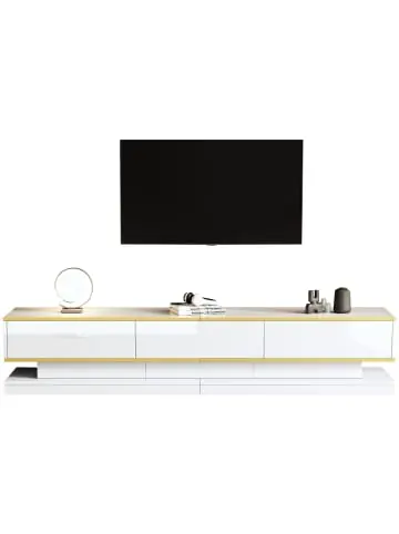 Modernes TV-Schrank & Couchtisch Set in Hochglanz-Optik *(200 cm TV-Schrank + 100 cm Couchtisch)*DESIGNHIGHLIGHTS: ✔ Edles Hochglanz-Design in warmem Weiß mit goldfarbenen Akzenten ✔ Moderne Asymmetrie – schmale Mitte mit breitem Ober- und Unterteil ✔ Hochwertige Spanplatten – robust und pflegeleichtPRAKTISCHE FUNKTIONEN:TV-Schrank (200x40x40 cm): • 3 geräuscharme Schubladen mit Soft-Close • Offene Fächer für Dekoration • 40 kg TragkraftCouchtisch (100x50x38 cm): • 2 große Schubladen • 30 kg BelastbarkeitVORTEILE: ✦ Leicht zu reinigende Hochglanzoberfläche ✦ Vielseitige Aufbewahrungsmöglichkeiten ✦ Passt zu modernen und skandinavischen Einrichtungsstilen ✦ Schlichte Eleganz für ein gemütliches WohnambienteTECHNISCHE DATEN: ▸ Material: Hochwertige Spanplatte ▸ Farbkombination: Warmweiß mit Goldakzenten ▸ Lieferumfang: 3 Pakete (separater Versand) ▸ Gesamtgewicht: 84 kgLIEFERUNG: ✓ TV-Schrank: 2 Pakete (je 27 kg) ✓ Couchtisch: 1 Paket (30 kg) ✓ Einfache Selbstmontage“Stylisches Wohnzimmer-Ensemble – wo Funktionalität auf modernes Design trifft!“PERFEKT FÜR: • Moderne Wohnzimmer • Kleine Apartments • DesignliebhaberPFLEGETIPP: Einfach mit Mikrofasertuch abwischen – keine speziellen Reiniger nötig!