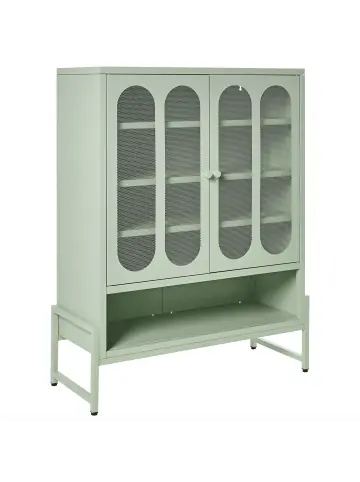 Mintgrüner Metallschrank mit perforierten Türen. Dieser halbhohe Mehrzweckschrank ist aus kaltgewalztem Stahl zusammengeschweißt und mit perforierten Türfronten ergänzt, die für die notwendige Belüftung sorgen. Dank der robusten Konstruktion und der Farbbeschichtung ist er vor Korrosion entsprechend geschützt und daher auch langanhaltend schön. Die offene Regalfläche hält alles griffbereit geordnet, während die verstellbaren Ablageböden im Schrankinneren Platz für alle Ihre Dokumente oder andere Sachen liefern. Zur Kippsicherung lässt sich der Metallschrank an der Wand befestigen.Details: Typ: Büroschränke Stil: Industriell Farbe: Grün Farbton: Mintgrün Material: Stahl Gestellmaterial: Metall Anzahl Einlegeböden: 5 Türöffnungsarten: Standard Schubladen: Nein Finish: Gefärbt Abschliessbar: Nein Türanzahl: 2 Regalböden: JaDimensions: Tiefe: 35 cm Breite: 84 cm Höhe: 108 cm Gewicht: 23 kg Max. Belastung pro Fach: 30 kg Max. Belastung der Oberplatte: 30 kgSie kaufen: 1 x SideboardProduktvorteile: Leicht zugängliches, offenes Regal, Stabile und solide Konstruktion, Perfekt geeignet für alle Wohn- und Arbeitsbereiche, Praktischer, großer Stauraum, Schutzkappen zum Schutz des Bodens, Lüftungsschlitze für konstanten LuftaustauschMontage: Nicht montiert. 20 – 40 Min.Zusatzinformationen: Bitte beachten: Aus Sicherheitsgründen muss das Produkt an der Wand montiert werden.Pflegeanleitung:Stahl: 1.Bitte ausschließlich handelsübliche, milde Reinigungsmittel und weiche Tücher verwenden, wobei feuchte Stellen sofort trocken gerieben werden sollten 2.Vermeiden Sie scheuernde Reiniger, da diese die Oberfläche beschädigen können 3.Bei Chrom und Kupfer regelmäßig mit speziellen Pflegemitteln polieren.