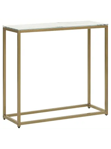 Rechteckiger Konsolentisch mit luxuriösem Marmor-Effekt. Dank der Material- und Farbkombination verleiht dieser Konsolentisch Ihrer Einrichtung eine einzigartige, elegante Note. Die pulverbeschichteten, goldenen Metallstreben des Untergestells sind miteinander verbunden und sorgen dabei für zusätzliche Standfestigkeit. Die Tischplatte aus hochwertigem Sicherheitsglas in Weiß bietet genug Platz für dekorative Accessoires, Ihre Lieblingsbücher, diverse Schlüssel oder Schmuck.Details: Typ: Konsolentisch Farbe: Weiß Material: Sicherheitsglas Zusätzliches Material: Metall Material Rand: Metall Gestellmaterial: Metall Tischplattenmaterial: Glas Schubladen: Nein Finish: Pulverbeschichtet Regalböden: NeinDimensions: Tiefe: 30 cm Breite: 80 cm Höhe: 76 cm Gewicht: 9 kg Max. Belastung der Oberplatte: 15 kgSie kaufen: 1x KonsolentischProduktvorteile: Elegante Optik, Passt ausgezeichnet zu vielen Einrichtungsstilen, Modernes Marmor-Finish, Stabile und solide Konstruktion, Hochwertiges Material, Schutzkappen zum Schutz des BodensMontage: Teilweise montiert. 20 – 40 Min.Pflegeanleitung:Sicherheitsglas: 1.Bitte ausschließlich milde Reinigungsmittel bzw. Glasreiniger und weiche Tücher verwenden. Feuchte Stellen mit einem weichen Tuch trocken reiben 2.Keine scheuernden Reinigungsmittel nutzen, da diese die Oberfläche beschädigen können.Metall: 1.Bitte ausschließlich handelsübliche, milde Reinigungsmittel und weiche Tücher verwenden, wobei feuchte Stellen sofort trocken gerieben werden sollten 2.Vermeiden Sie scheuernde Reiniger, da diese die Oberfläche beschädigen können 3.Bei Chrom und Kupfer regelmäßig mit speziellen Pflegemitteln polieren.