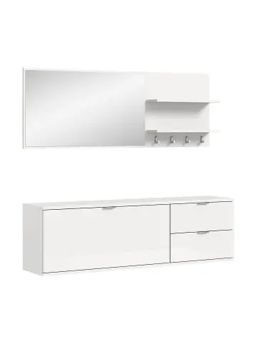 Das vierteilige Eingangsmöbel-Set ProjektX in Hochglanzweiß ist eine elegante und funktionale Lösung für den modernen Eingangsbereich. Es vereint Stauraum, Spiegel und Hängemöbel in einem harmonischen und praktischen Design, das den Raum optimal nutzt.Das Set besteht aus einem breiten Wandspiegel, einer Garderobe mit zwei offenen Ablagen und vier Metallgriffen sowie einer Schuhbank mit einer geräumigen Falttür und zwei Schubladen. Die glänzende Oberfläche sorgt für einen stilvollen Look, und die klaren Linien des Möbels lassen sich sowohl in kleine als auch in große Räume integrieren.Die verschiedenen Module lassen sich je nach Bedarf zusammen oder separat platzieren, was Ihnen Flexibilität bei der Gestaltung bietet. Die ProjektX-Serie ist FSC®-Mix-zertifiziert (FSC-C170479), was bedeutet, dass die Materialien aus dokumentierten und kontrollierten Quellen stammen.