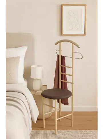 Toller Herrendiener für den Ankleideraum oder das Schlafzimmer…Praktisch: dieser Herrendiener dient auch gleichzeitig als Sitzgelegenheit. Gestell aus Stahlrohr, beigefarben pulverbeschichtet, Sitzfläche schaumstoffgepolstert und mit einem pflegeleichten Kunstlederbezug (100% Polyvinylchlorid), braun, bezogen. Maße ca. cm: B. 53 x T. 47 x H. 118 cm. Sitzhöhe ca. 48 cm.- Mit Hosenhalter- Mit Blusen-/Hemdenbügel- Mit bequemer Sitzfläche