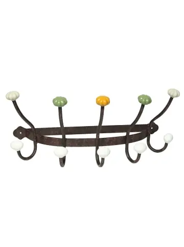 Unsere vormontierte Garderobe aus schönem Schmiedeeisen ist nicht nur die perfekte Ordnungshilfe, sie bringt auch noch ein ganz besonderes Ambiente in Ihr Zuhause. Die farbigen Keramikhaken unterstreichen Ihren modernen Landhausstil. Die obere Reihe verfügt über 5 farbige, skulpturierte Keramikhaken, die Haken in weiß der unteren Reihe sind oval. Um den nostalgischen Look zu erhalten, wurde der schmiedeeiserne Rahmen der Garderobe speziell mit einer Lackierung in verschiedenen Brauntönen behandelt. Dank dieser Lackierung ist die Garderobe für den Innen- wie auch Außenbereich geeignet. Mit Hilfe der schon vorgebohrten Löcher an der hinteren Seite ist eine schnelle und einfache Wandmontage gewährleistet (Schrauben sind nicht im Lieferumfang enthalten). Kein Stress – der Artikel wird komplett montiert geliefert. Länge Haken: 18,5 cm – Abstand zwischen den Haken: 10 cm.