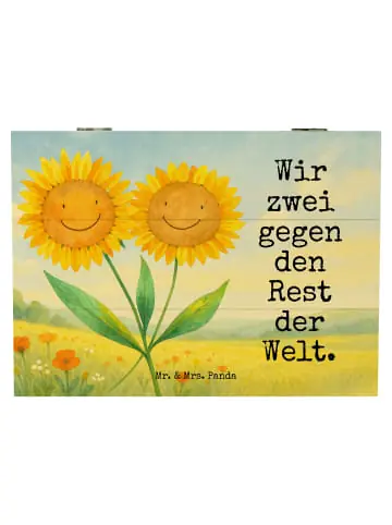 Die Holzkiste von Mr. & Mrs. Panda ist ein wunderschöner Platz, um all deine wertvollen Schätze und Erinnerungen zu bewahren. Sie ist nicht nur funktional, sondern verleiht jedem Raum einen Hauch von Eleganz. Die mit liebevollen Motiven und Sprüchen bedruckte Oberfläche bringt Freude in dein Zuhause. Du kannst die Kiste für alles Mögliche nutzen, sei es für persönliche Fotos, Erinnerungsstücke von besonderen Ereignissen oder als kreatives Geschenk für deine Freunde und Familie. Robust gefertigt aus Holzfaser, verspricht sie Langlebigkeit und Nachhaltigkeit. Die speziellen Einschlagscharniere machen es leicht, die Kiste zu öffnen und wieder zu schließen, sodass du immer schnell an deine Schätze kommst. Pflege sie einfach mit einem feuchten Tuch, um sie schön und gepflegt zu halten.Inspiration für Freundschaft – Sonnenblumen: Auf diesem wunderbaren Motiv siehst du zwei fröhliche Sonnenblumen, die mit ihrem Strahlen das Herz eines jeden Freundes höher schlagen lassen. Ihre leuchtend gelben Blütenblätter verkörpern die Freude und die Wärme, die Freunde miteinander teilen. Der Spruch ‚Wir zwei gegen den Rest der Welt‘ erzählt von einem unzertrennlichen Duo, das bereit ist, allen Widrigkeiten gemeinMensch die Stirn zu bieten. Diese Blüten sind nicht nur schön, sie erinnern uns daran, dass eine beste Freundin wie die Sonne ist – immer für uns da. Freundschaft ist ein kostbares Gut, und genau das strahlen die Sonnenblumen aus: Leidenschaft, Vertrauen und die Gewissheit, dass man nie alleine ist. Lass dich von ihrem strahlenden Lächeln inspirieren und sei stolz auf die Freundschaften in deinem Leben.Liebe & Natur: Die Flowerpower Kollektion von Mr. & Mrs. Panda nimmt dich mit auf eine Reise durch einen blühenden Garten, in dem Freude und Liebe in der Luft liegen. Unsere sorgfältig handgezeichneten Motive zeigen die Pracht der Natur in all ihrer Vielfalt. Von kleinen Blümchen bis zu prächtigen Gartenansichten – finde dein persönliches Stück Glück in unseren einzigartigen Produkten. Sie sind das ideale Geschenk für jeden Anlass oder einfach, um dir selbst eine Freude zu machen. Tauche ein in unsere Welt aus Blumen Deko, Frühlings Deko, und Sommer Deko, und lass deine Umgebung in einem neuen Licht erstrahlen. Die Flowerpower Kollektion wurde mit Herz und Seele von Mr. & Mrs. Panda geschaffen, um dir Freude und Inspiration zu bringen.Unser Produkt wird gesucht als: schmuckbox, Sommer Deko, Best Friends, Aufbewahrungsbox aus Holz, fotokiste, holzschachtel, Holzbox, Box, truhe holz, holzschatulle, Holztruhe, aufbewahrungskiste mit deckel, Holz Aufbewahrungsbox, Holzbox mit Deckel, Holzkiste, geschenkbox holz, Aufbewahrungsbox Holz, box holz, erinnerungsbox holz, Freundschaft, Sonnenblumen, Freundin, geschenkbox mit deckel, schatztruhe, Sonnenblume, Kiste, Erinnerungsbox, schmuckkiste, geschenkkiste, schmucktruhe, Geschenkbox, Truhe, Beste Freundin, holzkästchen, Erinnerungskiste, Aufbewahrungstruhe, Vertrauen, Kiste mit Deckel, Lieblingsmensch, Schatzkiste, kiste holz, Schatulle, Holzkiste mit Deckel, Box aus Holz, truhe mit deckel, fotobox, schatzkiste holz, ZuMenschmen, Aufbewahrungskiste