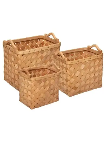 Ein Set aus unterschiedlich großen Körben zur Aufbewahrung von Wohnaccessoires erleichtert die Organisation und schmückt den InnenraumSet mit 3 Körben: Aufbewahrungsbehälter zu Hause nie genug! Und hier präsentieren wir ein neues Set mit drei Körben, in denen alle Arten von Zubehör und Haushaltsgeräten untergebracht werden können.Hergestellt aus natürlichen Materialien: Das Korb-Set besteht aus Naturholz (Tanne), was eine langfristige Nutzung garantiert. Darüber hinaus sind Holzprodukte Klassiker – sie sehen gut aus und halten lange Jahre.Ausgestattet mit Tragegriffen: Jeder der Körbe hat zwei Griffe, die das Tragen von Behältern bequem machen.Behälter in verschiedenen Größen: Korb haben unterschiedliche Größen. Die Maße der einzelnen Körbe sind: kleiner Korb: 26 x 19 x H. 23,5 cm, mittlerer Korb: 31,2 x 23,5 x H. 25,5 cm, großer Korb: 37 x 27 x H. 29,5 cmGewebtes Muster: Jeder Korb hat ein attraktives, geflochtenes Muster. Es wird sicherlich eine interessante dekorative Ergänzung für jeden Raum (Wohnzimmer, Schlafzimmer, Küche, Bad, Flur) sein. 3-teilige Aufbewahrungskörbe der französischen Marke Atmosphera ergänzen das Interieur mit zusätzlichem Stauraum. Es wird uns praktisch in jedem Raum dienen und wird zu seiner Dekoration. Ein zeitloses Fischgrätenmuster wird ein attraktives dekoratives Accessoire sein. Sie können Handtücher, Kosmetikutensilien, TV-Fernbedienungen, Computerzubehör, Hüte, Schals usw. verstecken.Dieses Produkt darf sicher und in der vom Hersteller vorgesehenen Weise verwendet werden und ausschließlich gemäß den Anweisungen, Empfehlungen, Warnungen oder Sicherheitsinformationen, die auf dem Produkt oder seiner Verpackung angebracht oder beigefügt sind.