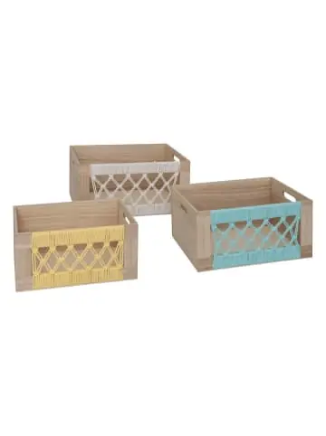 Spielzeugbehälter aus Paulownia Holz, bunt – praktisches Set zur Organisation des KinderzimmersPraktisches Set: Die Spielzeugbehälter AUSTRALIE sind ein Set aus drei Kisten, die bei der Organisation des Raumes im Kinderzimmer helfen. Hochwertige Materialien: Hergestellt aus Paulownia Holz, was für Langlebigkeit und Leichtigkeit der Konstruktion sorgt. Bunte Fronten: Jede Kiste verfügt über ein farbenfrohes, geflochtenes Paneel aus Baumwollschnur in Gelb-, Weiß- und Blautönen, was einen charmanten Akzent setzt und ins Auge fällt. Praktische Griffe: Die Kisten sind mit ausgeschnittenen Griffen ausgestattet, die das Tragen und Platzieren der Behälter an beliebigen Orten erleichtern. Kompakte Maße: Jede Kiste hat die Maße 36 x 18 x 26 cm, was sie ideal zur Aufbewahrung von Spielzeug, Büchern oder anderen Kleinigkeiten macht. Dieses Produkt darf sicher und in der vom Hersteller vorgesehenen Weise verwendet werden und ausschließlich gemäß den Anweisungen, Empfehlungen, Warnungen oder Sicherheitsinformationen, die auf dem Produkt oder seiner Verpackung angebracht oder beigefügt sind.