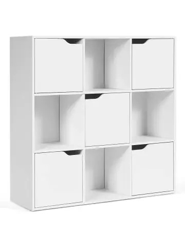 Bschreibung: Dieses schicke Sideboard wird aus dicken Spanplatten und hochwertigen Schrauben zusammengebaut, das robust und stabil für eine lange Lebensdauer ist. Hinzu kommt, dass das Regal an Ihrer Wand befestigt werden kann und somit vollkommene Sicherheit und Stabilität erhält. Es verbindet offenen und geschlossenen Stauraum und wird mit seiner Vielseitigkeit all Ihren Ansprüchen gerecht. Zudem optimiert dieses 9 fächrige Aufbewahrungsregal den limitierten Platz, den Ihr Zimmer bietet, und verhilft Ihnen zu reichlichem Stauraum für Ihre Bücher, Spielzeuge, Topfpflanzen und Dekorationen. Mit seinen klaren Linien und dem modernen Stil wird dieses Regal zu einer perfekten und praktischen Ergänzung in Ihrem Schlafzimmer, Wohnzimmer, Ihrer Küche oder dem Büro.Eigenschaften: Hergestellt aus hochwertigen Spanplatten, stabil und langlebig 9-Fächer Organizer für Stauraum und Präsentationsfläche 3-Ebenen Bücherregal mit viel Platz für Ihre Besitztümer Die glatte Oberfläche ist wasserresistent und leicht zu reinigen Perfekt für Schlafzimmer, Arbeitszimmer oder Büro Sowohl offene als auch private Regalfächer Modernes 3-Ebenen Bücherregal als stylishe Ergänzung Ihres Mobiliars Umkipp-Schutz bietet Ihnen zusätzliche Sicherheit Mühelos aufzubauen mit nummerierten Teilen und Anleitung Material: Spanplatten Maße: 90 cm x 29 cm x 90 cm (L x B x H) Tragkraft von Dach: 40 kg Tragkraft jedes Fachs: 10 kg Nettogewicht: 22 kgLieferungsumfang: 1 x Bücherregal 1 x Bauanleitung