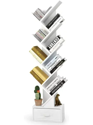 Beschreibung: Unser Baum-Bücherregal bietet viel Stauraum und nimmt wenig Platz ein! Das wie ein Baum gestaltete Bücherregal mit den Maßen 38 x 21,5 x 149,5 cm belebt Ihr Zuhause und zieht die Aufmerksamkeit der Gäste auf sich. Es gibt insgesamt 8 Regale und eine Stoffschublade, in denen Bücher und Kleinigkeiten ordentlich untergebracht werden können. Außerdem kann die Schublade für ein weiteres offenes Regal zur Dekorationsausstellung entfernt werden. Aus Sicherheitsgründen ist das Baum-Bücherregal aus hochwertigen Materialien gefertigt, sodass es eine perfekte Stabilität und Belastbarkeit aufweist. Zusammen mit einer Kippsicherung ergibt sich eine hervorragende Stabilität. Sie können es im Schlafzimmer, Wohnzimmer, Eingangsbereich und Arbeitszimmer platzieren. Das kompakte Standregal passt perfekt in eine schmale Ecke.Eigenschaften: Die baumartige Form sieht für die Dekoration attraktiver aus 8 offene Regale zur organisierten Aufbewahrung von Büchern Zusammenklappbare Stoffschublade zum bequemen Aufstellen und Aufbewahren Anti-Kipp-Vorrichtung, um zu verhindern, dass das Baum-Bücherregal umkippt Passt perfekt in eine Ecke, um viel Platz zu sparen Der Bodenschutz wird durch rutschfeste Fußpolster gewährleistet Anwendbar für Schlafzimmer, Wohnzimmer, Arbeitszimmer, Büro und mehr Ausführliche Anleitung für eine einfache und schnelle Installation Material: Holzwerkstoff, Stoff Gesamtabmessungen: 38 x 21,5 x 149,5 cm (L x B x H) Schubladenabmessungen: 35 x 18 x 14,5 cm (L x B x H) Schubladentiefe: 13,5 cm (H) Belastbarkeit jeder Ablage: 2,5 kg Nettogewicht: 12 kgLieferungsumfang: 1 x Bücherregal mit Schublade 1 x Benutzerhandbuch