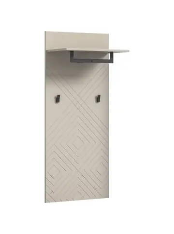 Notes Garderobe 2 Haken 1 Ablage mattbeige. Diese elegante und funktionale Aufbewahrungslösung eignet sich perfekt für den Eingangsbereich oder andere Räume, die sowohl praktische Aufbewahrung als auch ein modernes Design benötigen. Mit seinen wunderschön eingravierten geometrischen Mustern und einem minimalistischen, klaren Look bietet es ein Regal- und Hängesystem, das Ihre Schlüssel, Jacken und Kleinigkeiten organisiert und leicht zugänglich hält. Das Industriedesign mit der schwarzen Metallaufhängung verleiht einen besonders modernen Touch.