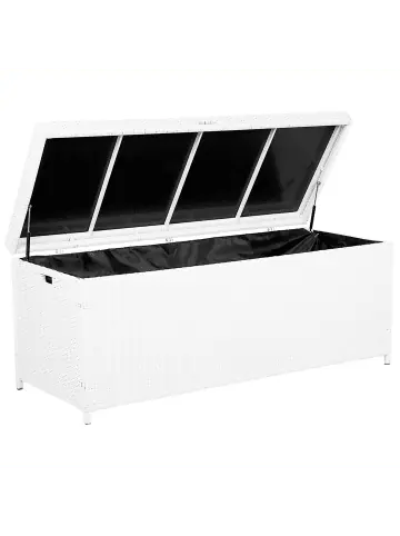 Praktische, breite Kissenbox in Weiß mit viel Stauraum. Unsere Kissenbox bietet viel Stauraum und schützt Ihre Kissen, Decken und Polster vor Regen und Sonne. Dank der zwei praktischen Griffe an den Seiten ist die Gartentruhe leicht zu transportieren. Der aus Polyrattan gefertigte Deckel lässt sich mittels zwei Gasdruckfedern spielend leicht öffnen und schließen. Eine schwarze Innenhülle verhindert das Eindringen von Schmutz und Insekten. Die einteilige Innenhülle wird mit einem starken Klettverschluss befestigt und hat somit optimalen Halt und kann bei Bedarf ausgewechselt oder gewaschen werden. Bitte beachten Sie, dass bei starken und andauernden Regenfällen die Box bedeckt werden sollte, damit sich das Wasser auf dem Deckel nicht ansammelt und ins Innere der Truhe eindringt.Details: Typ: Truhe Stil: Mediterran Farbe: Weiß Material: PE Rattan Zusätzliches Material: Stoff Volumen: 520Dimensions: Tiefe: 63 cm Breite: 158 cm Höhe: 66 cm Gewicht: 22 kg Max. Belastung: 100 kgSie kaufen: 1 x KissenboxProduktvorteile: Hochwertiges Material, Stabile Konstruktion des Gestells, UV-Beständigkeit, Grosszügiger Stauraum, Ausgestattet mit TragegriffenMontage: Nicht montiert. 45 – 60 Min.Zusatzinformationen: Damit das folgende Produkt jahrelang seine Schönheit beibehält, stellen wir Ihnen ein ausführliches Pflegehandbuch zur Verfügung. Die Pflegeanleitung und Tipps zur richtigen Wartung Ihres neuen Produkts finden Sie finden Sie unten im Abschnitt „Verpackung und Montage“.Beständigkeit: Feuchtigkeitsbeständig, Windbeständig, Schmutzbeständig, UV-beständigBeständigkeit Text: UV-strahlenbeständige Möbel weisen eine erhöhte Beständigkeit gegen Verblassen oder Verfärbung auf. Wir empfehlen jedoch, dass Sie das Produkt bei Nichtgebrauch abgedeckt aufbewahren. Dies gewährleistet die maximale Lebensdauer der Möbel. Das Produkt wurde aus Materialien gefertigt, die eine hohe Fleckenbeständigkeit aufweisen, weshalb es zu keinen Verfärbungen kommen sollte oder diese leicht zu beseitigen sind. Bei der Fleckenentfernung sind die Pflegehinweise zu berücksichtigen. Feuchtigkeitsbeständigkeit bedeutet, dass der Artikel leichtem Regenschauer und hoher Luftfeuchtigkeit im Außenbereich standhält. Sollte es nicht möglich sein, ihn drinnen zu lagern, sollte er mit einem Regenschutz abgedeckt werden. Wenn Möbel oder Accessoires längere Zeit Feuchtigkeit ausgesetzt werden, kann dies zu anhaltenden Schäden führen. Dieses Produkt besitzt eine hohe Windbeständigkeit, weshalb es nicht umkippen oder seine Stabilität aufgrund von Windböen verlieren sollte.Pflegeanleitung:PE Rattan: 1.Die Reinigung sollte nur mit handelsüblicher milder Seifenlauge erfolgen. Vermeiden Sie bitte starke chemische Reinigungsmittel 2.Um die Lebensdauer Ihrer Möbel zu verlängern, setzten Sie das Produkt keiner direkten Sonneneinstrahlung aus 3.Beachten Sie, dass durch die Lichtreflexion auf Glaselemente, die Kunststoffteile Ihres Produkts beschädigt werden können 4.Wir empfehlen für die Wintersaison eine Schutzhülle zu verwenden oder, wenn möglich, die Möbel trocken und kühl drinnen zu verwahren.