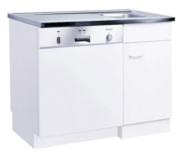 Spülenschrank mit einer Tür. Für Unterbau – Geschirrspüler. Mit Edelstahl – Auflagenspüle. Made in Germany