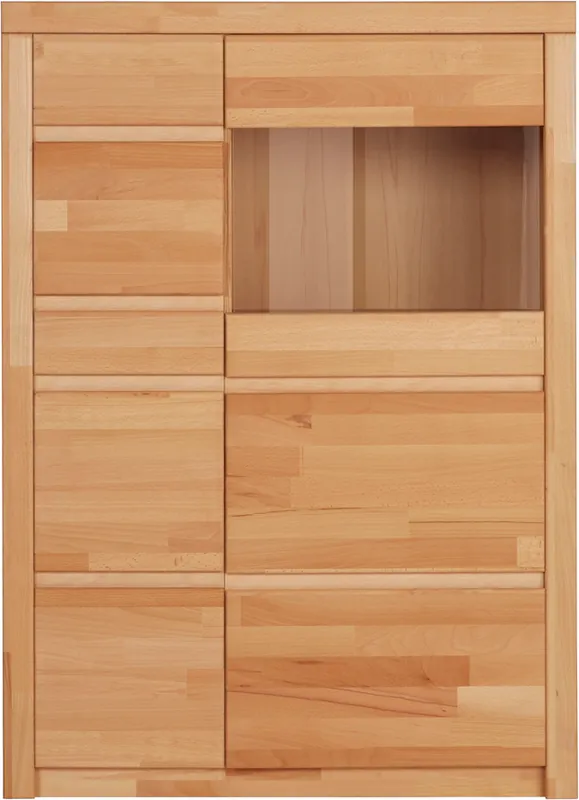 Maße (B/T/H): 90/35/125 cm. Teilmassiv. Türen mit Glaseinsatz. Pflegeleichte Oberflächen. Eingefräste Griffmulden