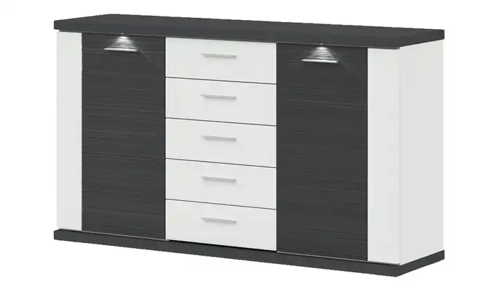 Das Sideboard Titan von uno schafft Stauraum im Wohn- und Esszimmer. Links und rechts ist jeweils eine Tür mit je drei Fächern dahinter zu finden. Mittig sind fünf Schubladen angeordnet. Titan ist in Weiß und Graphit (Nachbildung) designt. Die weißen Frontflächen sind hochglänzend, während die Frontakzente in Graphitoptik eine geriffelte Struktur haben. Damit sie noch besser zur Geltung kommt, wird das Sideboard mit einer LED-Frontbeleuchtung geliefert. Sie setzt tolle Lichtakzente.