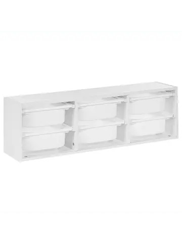 Hängeschrank für das Kinderzimmer. Dieses einzigartige Wandregal ist die perfekte Aufbewahrungslösung für jedes Kinderzimmer. Es ist aus strapazierfähiger Spanplatte gefertigt und leicht zu reinigen. Das Regal verfügt über 6 geräumige Schubladen in Form von Kunststoffkörben, in denen Kinder Spielzeug, Kleidung oder andere Gegenstände leicht verstauen können. Dank seiner neutralen weißen Farbe passt das Regal perfekt zu jeder Farbgestaltung des Zimmers und bietet vielfältige Gestaltungsmöglichkeiten.Details: Typ: Ablageregal Stil: Modern Farbe: Weiß Material: Faserplatte Zusätzliches Material: Polypropylen Material Rand: Holzwerkstoff Tischplattenmaterial: Holzwerkstoff Schubladen: Ja Finish: Matt Schutzkappen / Filzgleiter: Nein Schubladen: 6 Regalböden: NeinDimensions: Tiefe: 21 cm Breite: 98 cm Höhe: 29 cm Gewicht: 8 kg Max. Belastung der Schublade: 2 kg Max. Belastung der Oberplatte: 10 kgSie kaufen: 1 x Hängeschrank, 6 x AufbewahrungsboxProduktvorteile: Stauraum in leicht erreichbarer Höhe für Kinder, Praktische und geräumige Schubladen, Modernes Design, Stabile Konstruktion des Gestells, Pflegeleichtes und strapazierfähiges MaterialMontage: Nicht montiert. 20 – 40 Min.Pflegeanleitung:Faserplatte: 1.Bitte ausschließlich milde Reinigungsmittel und weiche Tücher verwenden. Feuchte Stellen sofort trocken reiben.Polypropylen: 1.Bitte ausschließlich milde Reinigungsmittel und weiche Tücher verwenden. Feuchte Stellen sofort trocken reiben.