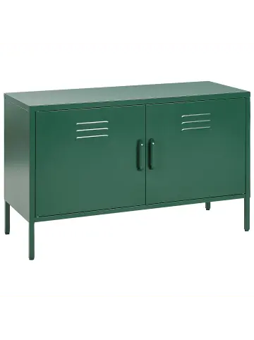 Modernes TV-Lowboard aus Metall mit 2 geräumigen Schränken. Ihr organisatorisches Wunder für Zuhause. Dank seiner robusten Verarbeitung aus kaltgewalztem Stahl und der schönen, einfachen Form eignet sich das Möbelstück hervorragend als TV-Schrank, schmückende Kommode oder Flurschrank. Hinter den 2 geräumigen Schränken verbirgt sich ein breiter Regalboden. Hier können Sie Dokumente, Bücher und andere Kleinigkeiten wunderbar verstauen, und sie vor neugierigen Blicken, Sonne und Staub schützen. Da der Metallschrank eine sehr leicht zu pflegende Oberfläche hat und mit Untersetzern versehen ist, kann er in jedem Wohnraum platziert werden.Details: Typ: Büroschränke Farbe: Grün Material: Stahl Gestellmaterial: Metall Anzahl Einlegeböden: 2 Türöffnungsarten: Standard Schubladen: Nein Finish: E-Coating Abschliessbar: Nein Türanzahl: 2 Regalböden: JaDimensions: Tiefe: 40 cm Breite: 100 cm Höhe: 65 cm Gewicht: 18 kg Max. Belastung pro Fach: 30 kg Max. Belastung der Oberplatte: 40 kgSie kaufen: 1 x SideboardProduktvorteile: Zeitloses Design, Stabile und solide Konstruktion, Perfekt geeignet für alle Wohn- und Arbeitsbereiche, Praktischer, großer Stauraum, Schutzkappen zum Schutz des Bodens, Lüftungsschlitze für konstanten LuftaustauschMontage: Nicht montiert. 20 – 40 Min.Pflegeanleitung:Stahl: 1.Bitte ausschließlich handelsübliche, milde Reinigungsmittel und weiche Tücher verwenden, wobei feuchte Stellen sofort trocken gerieben werden sollten 2.Vermeiden Sie scheuernde Reiniger, da diese die Oberfläche beschädigen können 3.Bei Chrom und Kupfer regelmäßig mit speziellen Pflegemitteln polieren.