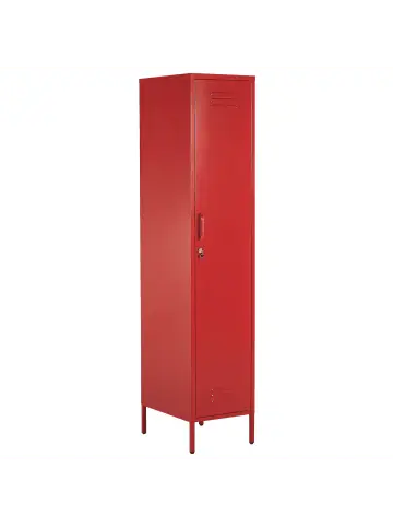 Praktischer, abschließbarer Stahlschrank mit 5 Fächern in Rot. Die stabile, geschweißte Konstruktion aus kaltgewalztem Stahl und die abschließbare Flügeltür garantieren, dass all Ihre vertraulichen Dokumente immer sicher aufbewahrt werden. Die herausnehmbaren Fachböden lassen Sie auch etwas Größeres im Hochschrank verstauen. Dank den praktischen Türhaken können kleine Deko-Akzente gesetzt oder Kleider aufgehängt werden. Kombiniert mit anderen Flügeltürenschränken kann er als Raumteiler dienen. Zudem ist das Modell mit Belüftungsschlitzen versehen und sehr leicht zu reinigen.Details: Typ: Kleiderschrank Farbe: Rot Material: Stahl Gestellmaterial: Metall Anzahl Einlegeböden: 5 Türöffnungsarten: Standard Schubladen: Nein Finish: E-Coating Abschliessbar: Ja Türanzahl: 1 Regalböden: JaDimensions: Tiefe: 50 cm Breite: 38 cm Höhe: 185 cm Gewicht: 28 kg Max. Belastung pro Fach: 20 kg Max. Belastung der Oberplatte: 30 kgSie kaufen: 1 x BüroschrankProduktvorteile: Höhenverstellbare Einlegeböden, Praktische Türhaken lassen alles übersichtlich verstauen, Perfekt geeignet für alle Wohn- und Arbeitsbereiche, Abschliessbar zur sicheren Aufbewahrung, Schutzkappen zum Schutz des Bodens, Lüftungsschlitze für konstanten LuftaustauschMontage: Nicht montiert. 20 – 40 Min.Pflegeanleitung:Stahl: 1.Bitte ausschließlich handelsübliche, milde Reinigungsmittel und weiche Tücher verwenden, wobei feuchte Stellen sofort trocken gerieben werden sollten 2.Vermeiden Sie scheuernde Reiniger, da diese die Oberfläche beschädigen können 3.Bei Chrom und Kupfer regelmäßig mit speziellen Pflegemitteln polieren.