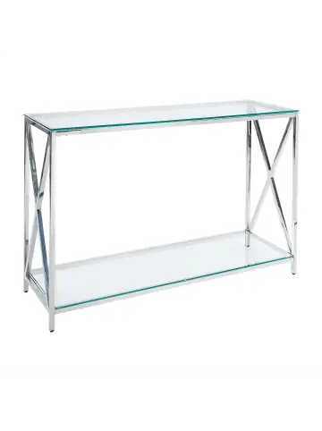 Moderne, rechteckige Wohnzimmerkonsole mit Edelstahlgestell und Ablagen aus Sicherheitsglas . Setzen Sie auf diesen hochwertigen Flurtisch, der über ein praktisches, dennoch modernes Design verfügt. Er ist mit 2 breiten, transparenten Ablagen aus robustem Hartglas versehen. So erhalten Sie genügend Ablagefläche nicht nur für Ihre Dekoartikel oder Schlüssel, sondern auch für viele wietere Dinge, die Sie gerne in Ihrer Reichweite haben möchten. Wegen seiner schmalen Form kann er als Schminktisch in der Garderobe oder im Schlafzimmer sowie als zusätzlicher Beistelltisch im Ess- oder Eingangsbereich verwendet werden. Das silberfarbene Edelstahlgestell sorgt für einen glanzvollen Look und angemessene Stabilität. Dank den zusätzlichen Kunststoff-Schutzgleitern ist auch Ihr Fußboden entsprechend geschützt.Details: Typ: Konsolentisch Farbe: Silber Material: Sicherheitsglas Zusätzliches Material: Edelstahl Material Rand: Metall Gestellmaterial: Metall Tischplattenmaterial: Glas Schubladen: Nein Finish: Poliert Schutzkappen / Filzgleiter: Ja Regalböden: JaDimensions: Tiefe: 40 cm Breite: 120 cm Höhe: 76 cm Gewicht: 22 kg Max. Belastung der Oberplatte: 10 kgSie kaufen: 1x KonsolentischProduktvorteile: Elegantes Design, Stabile und solide Konstruktion, Besonders pflegeleicht und langlebig, Schutzkappen zum Schutz des Bodens, Robuste Tischplatte aus SicherheitsglasMontage: Nicht montiert. 20 – 40 Min.Pflegeanleitung:Sicherheitsglas: 1.Bitte ausschließlich milde Reinigungsmittel bzw. Glasreiniger und weiche Tücher verwenden. Feuchte Stellen mit einem weichen Tuch trocken reiben 2.Keine scheuernden Reinigungsmittel nutzen, da diese die Oberfläche beschädigen können.Edelstahl: 1.Bitte ausschließlich handelsübliche, milde Reinigungsmittel und weiche Tücher verwenden, wobei feuchte Stellen sofort trocken gerieben werden sollten 2.Vermeiden Sie scheuernde Reiniger, da diese die Oberfläche beschädigen können 3.Bei Chrom und Kupfer regelmäßig mit speziellen Pflegemitteln polieren.