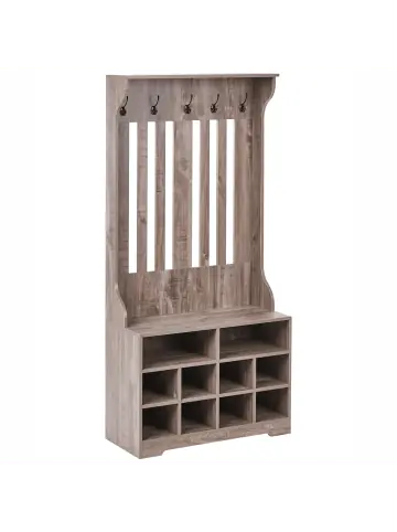 Garderobe mit offenen Schuhfächern und 5 Haken. Diese elegante Flurgarderobe in warmer Holzoptik ist die perfekte Lösung, um Ihren Eingangsbereich organisiert und einladend zu gestalten. Sie verfügt über einen praktischen Schrank mit mehreren Fächern für Schuhe und Alltagsgegenstände, während das obere Paneel stabile Haken für Mäntel, Taschen oder Schals bietet. Die vertikalen Lamellen und das schlichte Design verleihen der Garderobe eine rustikal und zugleich gemütliche Note.Details: Typ: Schuhschrank Farbe: Braun Farbton: Dunkelbraun Material: Spanplatte Material Rand: Holzwerkstoff Tischplattenmaterial: Holzwerkstoff Schubladen: Nein Finish: Melamin Schutzkappen / Filzgleiter: Nein Regalböden: Ja Volumen: für 12 Paar SchuheDimensions: Tiefe: 35 cm Breite: 80 cm Höhe: 170 cm Gewicht: 37 kg Max. Belastung pro Fach: 30 kg Max. Belastung der Oberplatte: 60 kgSie kaufen: 1 x Schuhaufbewahrung mit KleiderständerProduktvorteile: Sichere und abgerundete Haken, Passt wunderbar zu jedem Einrichtungsstil, Holzähnliches Finish für einen möglichst naturnahen Look, Stabile und solide Konstruktion, Hohe Qualität, Viel StauraumMontage: Nicht montiert. 20 – 40 Min.Zusatzinformationen: Bitte beachten: Aus Sicherheitsgründen muss das Produkt an der Wand montiert werden.Pflegeanleitung:Spanplatte: 1.Bitte ausschließlich milde Reinigungsmittel und weiche Tücher verwenden. Feuchte Stellen sofort trocken reiben.