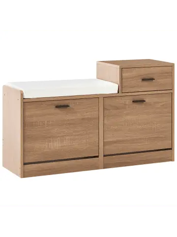 Moderner Schuhkipper mit 2 Klappen und 1 Schublade. Dieser Schuhschrank punktet mit seinem cleveren Design, das Ihnen sowohl Komfort als auch Ordnung und Stil liefert. Er besitzt zwei Schuhkippfächer mit Push-to-Open-Mechanik und eine Schublade mit Soft-Close-Funktion. Zudem ist der Schuhkipper in einer hellen Holzoptik gehalten, die sich fantastisch in allen Fluren und Eingangsbereichen macht. Für sicheren Stand sorgen die mitgelieferten Haken, die das Möbelstück sicher mit der Wand verbinden lassen.Details: Typ: Schuhschrank Farbe: Braun Farbton: Hellbraun Material: Faserplatte Material Rand: Holzwerkstoff Gestellmaterial: Holzwerkstoff Tischplattenmaterial: Holzwerkstoff Finish: Papierfurnier Schutzkappen / Filzgleiter: Nein Volumen: für 12 Paar SchuheDimensions: Tiefe: 30 cm Breite: 92 cm Höhe: 57 cm Gewicht: 27 kg Max. Belastung der Oberplatte: 15 kgSie kaufen: 1 x SchuhschrankProduktvorteile: Ein einzigartiger Hingucker, Passt wunderbar zu jedem Einrichtungsstil, Qualitativ hochwertiges Material, Stabile und solide Konstruktion, Praktische AbstellflächeMontage: Nicht montiert. 20 – 40 Min.Zusatzinformationen: Um die Haltbarkeit und die Ästhetik der Arbeitsplatte zu erhalten, sollte man Platzsets und Untersetzer verwenden und feuchte Stellen schnellstmöglich trocken wischen, um Produktschäden zu vermeiden.Pflegeanleitung:Faserplatte: 1.Bitte ausschließlich milde Reinigungsmittel und weiche Tücher verwenden. Feuchte Stellen sofort trocken reiben.