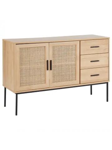 Hellbraunes Boho-Sideboard mit 3 Rattan-Türen und 3 Schubladen. Aufbewahrungsschränke müssen nicht unbedingt einheitlich und eintönig sein. Dieser Beistellschrank mit natürlichen Rattafronten sticht hervor und verleiht Ihrem Wohn- oder Schlafzimmer einen Boho-Touch. Stellen Sie ruhig Dekoartikel, Blumentöpfe oder Bücher auf die Ablagefläche und nutzen Sie die geräumigen Schränke und Schubladen darunter wirkungsvoll aus. Die schwarzen Metallbeine setzen einen farblichen Kontrast und sorgen gleichzeitig für Robustheit und Langlebigkeit.Details: Typ: Sideboard Farbe: Braun Material: Faserplatte Zusätzliches Material: Rattan Material Rand: Holzwerkstoff Gestellmaterial: Metall Tischplattenmaterial: Holzwerkstoff Türöffnungsarten: Push-to-open Schubladen: Ja Finish: Papierfurnier Schutzkappen / Filzgleiter: Nein Türanzahl: 2 Schubladen: 3 Regalböden: JaDimensions: Tiefe: 39 cm Breite: 120 cm Höhe: 77 cm Gewicht: 32 kg Max. Belastung der Schublade: 5 kg Max. Belastung pro Fach: 15 kg Max. Belastung der Oberplatte: 30 kgSie kaufen: 1 x SideboardProduktvorteile: Holzähnliches Finish für einen möglichst naturnahen Look, Wunderbar geeignet für Schlaf- und Wohnbereich, Gemütliche Ausstrahlung, Präzise ausgearbeitete Details, Für die optimale Pflege schützen Sie die Oberfläche mit Untersetzern und Platzsets vor Hitze und Feuchtigkeit. Viel StauraumMontage: Teilweise montiert. 45 – 60 Min.Zusatzinformationen: Um die Haltbarkeit und die Ästhetik der Arbeitsplatte zu erhalten, sollte man Platzsets und Untersetzer verwenden und feuchte Stellen schnellstmöglich trocken wischen, um Produktschäden zu vermeiden.Pflegeanleitung:Faserplatte: 1.Bitte ausschließlich milde Reinigungsmittel und weiche Tücher verwenden. Feuchte Stellen sofort trocken reiben.Rattan: 1.Die Reinigung sollte ausschließlich mit einem weichen, trockenen Tuch und ohne Reinigungsmittel erfolgen.