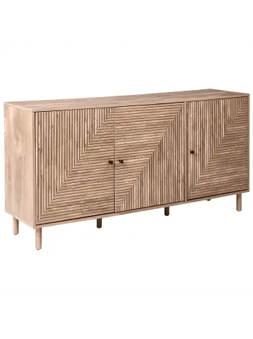 Modernes Sideboard mit 3 Türen und robusten Holzbeinen. Dieser lange Schrank passt geradezu in jede Ecke Ihres Zuhauses und wird mit seiner hellen Holzoptik und den originellen, gerillten Fronten garantiert auffallen. Mit sechs geräumigen Ablageflächen hinter den drei Türen bietet er praktischen Stauraum für Alltagsgegenstände und hilft Ihnen dabei, Ihren Raum ordentlich zu halten. Zudem ist der MDF-Korpus laminiert und daher auch äußerst pflegeleicht. Der Allzweckschrank steht auf schlanken, dennoch soliden Kiefernholzbeinen und eignet sich ideal für Flure, Ess-, Wohn- oder Schlafzimmer.Details: Typ: Sideboard Stil: Mediterran Farbe: Braun Farbton: Hellbraun Material: MDF-Platte Zusätzliches Material: Eisen Material Rand: Holzwerkstoff Gestellmaterial: Holz Tischplattenmaterial: Holzwerkstoff Türöffnungsarten: Standard Schubladen: Nein Finish: Laminiert Schutzkappen / Filzgleiter: Nein Türanzahl: 3 Regalböden: JaDimensions: Tiefe: 40 cm Breite: 150 cm Höhe: 75 cm Gewicht: 37 kg Max. Belastung pro Fach: 5 kg Max. Belastung der Oberplatte: 20 kgSie kaufen: 1 x SideboardProduktvorteile: Holzähnliches Finish für einen möglichst naturnahen Look, Gut kombinierbar mit vielen Einrichtungsstilen, Besonders pflegeleicht und langlebig, Stabiles und strapazierfähiges Gestell, Zusätzlicher StauraumMontage: Nicht montiert. 20 – 40 Min.Zusatzinformationen: Um die Haltbarkeit und die Ästhetik der Arbeitsplatte zu erhalten, sollte man Platzsets und Untersetzer verwenden und feuchte Stellen schnellstmöglich trocken wischen, um Produktschäden zu vermeiden.Pflegeanleitung:MDF-Platte: 1.Bitte ausschließlich milde Reinigungsmittel und weiche Tücher verwenden. Feuchte Stellen sofort trocken reiben.Kiefernholz: 1.Bitte ausschließlich milde Reinigungsmittel und weiche Tüchern verwenden. Dabei immer in Richtung der Maserung abwischen 2.Sofort nach der Reinigung abtrocknen, um zu verhindern, dass sich Wasser auf dem Produkt absetzt 3.Nur bei geölten Holzartikeln befolgen: Sie sollten nach einiger Zeit nachgeölt werden, damit sie lange in einem guten Zustand erhalten bleiben.