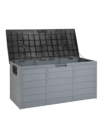 Kunststoff Aufbewahrungsbox mit Rollen. Mit dieser geräumigen Aufbewahrungsbox können Sie Ihre Gartengeräte, Outdoor-Kissen oder Regenabdeckungen, wenn Sie sie nicht benötigen, leicht verstauen. Aus langlebigem synthetischem Material gefertigt, benötigt die Box keine tägliche Pflege, um viele Jahre lang zu halten. Dank des Deckels, der den oberen Teil des Behälters abdeckt, werden die darin aufbewahrten Gegenstände nicht schmutzig. Die Aufbewahrungsbox ist mit Griffen und Rollen ausgestattet, so dass Sie sie leicht und immer, wann Sie möchten, bewegen können.Details: Typ: Truhe Farbe: Grau Material: Kunststoff Volumen: 245Dimensions: Tiefe: 50 cm Breite: 112 cm Höhe: 53 cm Gewicht: 8 kg Max. Belastung: 100 kgSie kaufen: 1 x AufbewahrungsboxProduktvorteile: Leichtgängige Nylon Laufrollen, Modernes Design, Besonders pflegeleicht und langlebig, Ausgestattet mit Tragegriffen, Unkomplizierte SelbstmontageMontage: Nicht montiert. 20 – 40 Min.Pflegeanleitung:Kunststoff: 1.Die Reinigung kann mit handelsüblicher milder Seifenlauge und einem weichen Tuch erfolgen 2.Die Verwendung eines Grills in der Nähe des Möbelstücks sollte mit grösster Vorsicht geschehen, da Funken der Holzkohle stellenweise Beschädigungen verursachen können. Legen Sie aus diesem Grund auch keine heissen Grillzangen und Spiesse auf die Tischplatte 3.Das Material ist extrem witterungbeständig. Jedoch empfehlen wir für die Wintersaison eine Schutzhülle zu verwenden oder, wenn möglich, die Möbel trocken und kühl drinnen zu lagern.