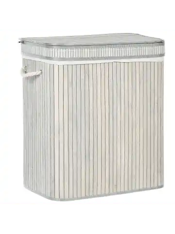 Moderner, handgefertigter Wäschekorb mit 2 Fächern, Deckel und Wäschesack. In diesem hohen Bambuskkorb gibt es bestimmt genügend Platz für Ihre Wäsche, Handtücher oder Leinen. Die Wäschetonne verzaubert mit ihren hochwertigen und langlebigen Materialien sowie ihrer robusten Verarbeitung. Das Modell ist vollständig aus Bambusholz handgefertigt und verfügt über einen herausnehmbaren Stoffeinsatz sowie einen passenden Deckel. Dank des praktischen Reißverschlusses an dem Deckel ist der Korb verschließbar und somit geruchsneutral. So können Sie ihn getrost in jedem Badezimmer, Schlafzimmer oder jeder Waschküche plazieren. Für eine bequeme Nutzung sorgt auch der Innensack, der über 2 Kammern verfügt. Auf diese Weise können Sie ihre Wäsche immer angenehm sortieren.Details: Typ: Wäschekörbe Farbe: Grau Farbton: Hellgrau Material: Bambusholz Zusätzliches Material: Stoff Zusammenstellung: 73% Polyester Form: Rechteckig Finish: Farbig Handgefertigt: Ja Volumen: 100Dimensions: Tiefe: 34 cm Breite: 52 cm Höhe: 60 cm Gewicht: 2.3 kgSie kaufen: 1 x KorbProduktvorteile: Die natürliche Holzmaserung und Knoten machen jedes Stück zu einem Unikat, Hohe Qualität, Handgefertigte Präzision, Ausgestattet mit Tragegriffen, Multifunktional, Nimmt verschiedene Aufbewahrungsbedürfnisse aufMontage: Benötigt keine MontageZusatzinformationen: Holz ist ein natürliches Material, daher bleibt die feine, natürliche Struktur und die ganz besondere Optik der Holzoberfläche trotz der Farbschicht erhalten. Da bei der Herstellung natürliche Materialien verwendet werden, können kleine Farb-, Form-, bzw. Größendifferenzen auftreten. Diese Unterschiede stellen jedoch keinen Produktfehler dar.Pflegeanleitung:Bambusholz: 1.Bitte ausschließlich milde Reinigungsmittel und weiche Tüchern verwenden. Dabei immer in Richtung der Maserung abwischen 2.Sofort nach der Reinigung abtrocknen, um zu verhindern, dass sich Wasser auf dem Produkt absetzt 3.Nur bei geölten Holzartikeln befolgen: Sie sollten nach einiger Zeit nachgeölt werden, damit sie lange in einem guten Zustand erhalten bleiben.Stoff: 1.Von Hand oder mit einem Feinwäsche-Programm bei max. 30°C waschen, wenn auf dem Etikett keine weiteren Hinweise des Herstellers gegeben sind 2.Wenn auf dem Etikett nicht anders angegeben, bitte nicht im Trockner trocknen und auch nicht bügeln.