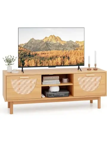 Beschreibung: Der Medienkonsolentisch bietet eine Mischung aus Funktionalität und stilvollem Design und ist auf die Unterstützung von Fernsehern bis zu 55 Zoll zugeschnitten. Dieser TV-Ständer spiegelt die zeitlose Ästhetik der Mitte des Jahrhunderts wider und verfügt über bezaubernde Schubladen aus Bambusgeflecht, die eine harmonische Balance zwischen klassischem Design und Stauraumbedarf bieten. Zusätzlich ermöglichen die offenen Regale einen einfachen Zugriff auf elektronische Geräte. Der TV-Ständer ist auf Komfort ausgelegt und verfügt über zwei Kabelführungslöcher, die eine organisierte und ordentliche Einrichtung erleichtern. Eigenschaft: Die breite Tischplatte bietet Platz für Flachbildfernseher mit 43 Zoll/50 Zoll/55 Zoll. 2 offene Regale und 2 Schubladen vergrößern den Lager- und Ausstellungsraum Atmungsaktive, gewebte Bambusmuster verleihen dem TV-Ständer ein Highlight Die Beine aus massivem Holz sorgen für hervorragenden Halt und Stabilität Mit rutschfesten Fußpolstern zur Vermeidung von Kratzern 2 Kabellöcher verwalten effektiv unordentliche Kabel und sorgen für Ordnung in Ihrem Zimmer Wird als auffälliger TV-Begleiter oder Aufbewahrungsschrank verwendet Der praktische Griff und die leichtgängigen Schubladenführungen erleichtern das Herausziehen Genügend Freiraum erleichtert die Reinigung des Raumes darunterTechnische Daten: Material: MDF, Holzwerkstoff, Bambus, Kiefernholz Gesamtmaße: 120 x 35 x 45,5 cm (L x B x H) Innenmaße der Schublade: 33 x 28,5 x 17,5 cm (L x B x H) Maße des offenen Regals: 38 x 31,5 x 12,5 cm (L x B x H) Abstand zwischen Schrank und Boden: 10,5 cm Tragfähigkeit der Tischplatte: 80 kg Maximales Gewicht der Schublade: 20 kg Maximales Gewicht des Regals: 15 kg Nettogewicht: 23 kgLieferungsumfang: 1 x TV-Schrank 1 x Handbuch