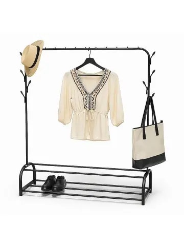 Optimiere Deine Kleideraufbewahrung mit diesem funktionalen Kleiderständer! Das 3-in-1-Design vereint eine robuste Kleiderstange für Jacken, 2 großzügige Ablagen für Schuhe und 8 praktische Haken für Taschen, Hüte und mehr. Hergestellt aus langlebigem Stahl bietet die Standgarderobe Stabilität und Stil in einem. Der Kleiderständer passt dank seinem platzsparenden Design perfekt in Flur, Schlafzimmer oder Büro.Kleiderständer im Detail – Maße H x B x T: ca 158 x 110 x 40 cm – Traglast: max. 30 kg – Gewicht: ca. 2,8 kg – Material: Eisen – In verschiedenen FarbenGarderobenständer mit Ablage – Für mehr Ordnung im Flur, Büro, Schlafzimmer etc. – Mit Kleiderstange für Jacken und Mäntel – 2 praktische Ablageflächen für Schuhe – 8 Haken für Hüte, Tasche u. a. Accessoires – Modernes Design fügt sich überall gut einLieferumfang – 1x Kleiderständer in Einzelteilen – Montagematerial und Anleitung – Dekoartikel sind nicht im Lieferumfang enthalten