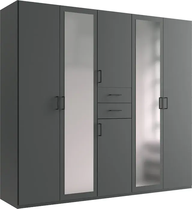 Schubladen auf bequemer Zugriffshöhe, Laufleisten aus Metall. Moderne, zeitlose Griffe in schwarz. Mit zwei Spiegeltüren. Innendekor Line grey. Made in Germany