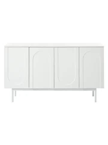 Produkteigenschaften:Elegantes Design: Gewölbte Türen mit symmetrischen Mustern, klare Linienführung für modernen LookHochwertige Materialien: MDF (Ober-/Unterseite) + Spanplatte (Seitenteile) + lackierte MetallbeineFlexible Innenaufteilung: 2 verstellbare Einlegeböden mit 3 Höhenpositionen, herausnehmbarStabile Konstruktion: Industrielle Metallbeine, hohe Stabilität und langlebige QualitätVielseitig einsetzbar: Passt in Wohnzimmer, Esszimmer oder Flur, helle OptikMaterial: MDF (Tischplatte/Boden) + Spanplatte (Korpus) + Metall (Beine)Türabmessungen: 34,7 × 58,1 cm (B × H)Tragkraft: Tischplatte 40 kg, Regale je 10 kgMontagezeit: Ca. 1 StundeLieferumfang: 2 Pakete (inkl. Werkzeug)Aufbau & Funktionen:Gewölbte Türen mit dekorativen MusternVerstellbare Einlegeböden für flexible NutzungLackierte Metallbeine für industriellen AkzentStrahlend weiße Oberfläche für helle RaumwirkungPflegehinweise:Verschüttetes sofort mit feuchtem Tuch abtupfenKeine aggressiven Reinigungsmittel verwendenRegelmäßig Verbindungen überprüfenBefestigungselemente nicht übermäßig anziehenEinsatzbereiche:Wohnzimmer als Medieneinheit oder DekorationsmöbelEsszimmer als Servierfläche und AufbewahrungFlur als elegante StauraumlösungBüro als Ablage für UtensilienVorteile:Zeitloses Design für verschiedene EinrichtungsstileFlexible Innenaufteilung für individuelle BedürfnisseRobuste Konstruktion für langjährige NutzungHelle Farbe verleiht Räumen Frische und FreundlichkeitHinweis: Lieferung in zwei Paketen. Leichte Farb- und Maßabweichungen möglich. Vollständige Montage erforderlich.