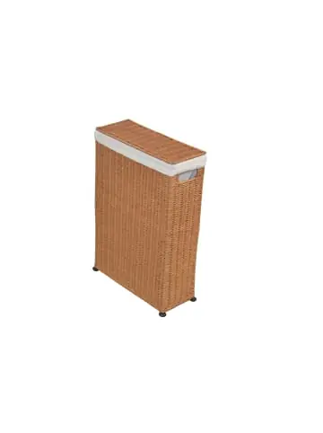 Dieser praktische, handgeflochtene Raumspar-Wäschekorb ist mit Rattangeflecht in den Farben honigfarben gebeizt und lackiert, braun gebeizt und lackiert, beigefarben gebeizt und lackiert oder weiß lackiert lieferbar. Ideal für kleine Räume und manche ungebrauchte Nische wird optimal ausgenutzt. Mit aufklappbarem Deckel, zum Schutz ihrer Wäsche mit einem herausnehmbaren, cremefarbenen Wäschesack (65% Baumwolle/35% Polyester) ausgestattet, bei 30°C waschbar. Stabiles Gestell aus Eisen,Ohne Dekoration. Maße ca. cm: B. 16 x H. 59 x T. 39- In 4 Farben lieferbar- Handgeflochten- Inklusive herausnehmbaren Wäschesack