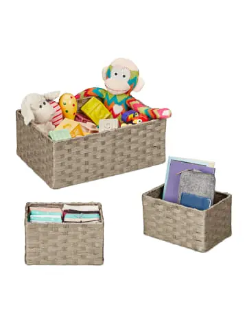 Mit dem 3-teiligen Aufbewahrungskorb-Set bist Du perfekt ausgerüstet, um verschiedene Dinge des Alltags übersichtlich aufzubewahren. Verstaue in den geflochtenen Dekokörben in 2 Größen Kosmetik im Bad, Socken und Unterwäsche im Kleiderschrank oder verwende die Flechtkörbe als dekorative Aufbewahrungslösung in Wohnzimmer und Flur. Auch als Schubladen-Organizer für das Büro machen die Körbe eine gute Figur. Bei Nichtgebrauch können sie platzsparend ineinander gestapelt werden.Aufbewahrungskorb im 3er Set – Maße großer Korb H x B x T: ca. 14 x 35 x 24,5 cm / ca. 360 g – Maße kleine Körbe H x B x T: je ca. 12,5 x 21 x 15 cm / je ca. 190 g – Traglast großer Korb: ca. 1,5 kg – Traglast kleine Körbe: je ca. 0,6 kg – Material: Papierseil, Eisen – Farbe: GrauFlechtkörbe zur Aufbewahrung – Ideal für Kosmetik und andere Badutensilien – Praktisch auch in Wohn-, Schlaf- oder Kinderzimmer – 2 verschiedene Größen passend für jeden Bedarf – Geflochtenes Papierseil setzt dekorative Akzente – Körbe bei Nichtgebrauch ineinander stapelbarLieferumfang – 3x Badkörbchen – Dekoartikel sind nicht im Lieferumfang enthalten