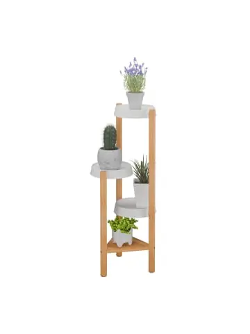 Die große Pflanztreppe schafft den nötigen Platz, um Deine geliebten Zimmerpflanzen dekorativ zu präsentieren. Ob Blumen- oder Pflanztopf, Trockenblumen oder Dekoartikel, auf den Ablagen der Pflanzenetagere kommen Deine Arrangements bestens zur Geltung. Ob im Wohn-, Schlafzimmer, Flur oder Wintergarten, der Blumentopfständer lässt sich vielseitig platzieren. Das Blumenregal überzeugt mit seinem Mix aus natürlichem Bambus und weißen Ablagen.Pflanzenständer im Detail – Weiß mit 3 Ablagen H x B x T: ca. 78 x 28 x 34 cm / ca. 1,6 kg – Weiß mit 4 Ablagen H x B x T: ca. 85 x 32 x 33 cm / ca. 1,9 kg – Natur mit 3 Ablagen H x B x T: ca. 78 x 25 x 22 cm / ca. 1,7 kg – Natur mit 4 Ablagen H x B x T: ca. 78 x 28 x 34 cm / ca. 1,8 kg – Traglast je Ablage: max. 5 kg – Runde Ablagen D innen: ca. 17,5 cm – Eckige Ablagen B x T: ca. 18,5 x 18 cm – Material: Bambus, Kunststoff – Farbe: Natur, WeißPflanzenregal für Deine grünen Schätze – Topfpflanzen, Trockenblumen oder Deko in Szene setzen – Für ein grünes Wohlfühlklima in Schlaf-, Wohnzimmer oder Flur – Pflanzenständer mit verschiedenen Ablagen bietet viel Stauraum – Natürliches Gestell aus Bambus als echter Blickfang – Unkomplizierter Aufbau mit beiliegender AnleitungLieferumfang – 1x Pflanzenetagere in Einzelteilen – Mit Anleitung – Mit Montagematerial – Dekoartikel sind nicht im Lieferumfang enthalten