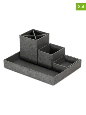 Im Set enthalten: – 1 Basis-Tablett – 3 Organizer-Boxen in verschiedenen Größen- Material: Papierlaminat, mitteldichte Holzfaserplatte – ideal für die geordnete Ablage von Stiften, Kugelschreibern und anderen UtensilienHinweis: Dekoration ist nicht im Lieferumfang enthalten.