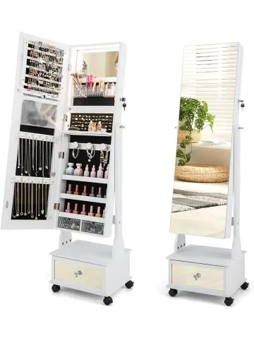 Beschreibung: Dieser 3-in-1 Schmuckschrank ist ein toller Helfer bei der Schmuckaufbewahrung und beim täglichen Anziehen. Der Stehschmuckschrank ist mit 2 Spiegeln ausgestattet: einem Ganzkörperspiegel und einem eingebauten Schminkspiegel. Der Schminkspiegel ist von dreifarbigen LED-Leuchten umgeben und die klappbare Ablage sorgt für mehr Komfort beim Schminken. Dieser Schmuck- und Kosmetik-Organizer ist mit Haken, Schlitzen, Regalen, Schubladen und mehr ausgestattet, um alle wichtigen Dinge in Ordnung zu halten. Der Ganzkörperspiegel lässt sich in 3 Winkeln verstellen und die feststellbaren Universalräder bieten große Flexibilität.Eingenschaften: Verfügt über einen Ganzkörperspiegel außen und einen Schminkspiegel innen Großes Fassungsvermögen mit vielen Haken, Schlitzen, Regalen, Schubladen und mehr Ausgestattet mit einem ausklappbaren Make-up-Regal zum Platzieren von Kosmetika oder Schmuck Eingebaute dreifarbige LED-Leuchten, die für Ihr routinemäßiges Make-up entwickelt wurden Kann je nach Körpergröße des Benutzers in 3 Winkeln eingestellt werden Verwendet Magnetverschluss und langlebige Metallscharniere Müheloses Bewegen durch 4 feststellbare Universalräder Einfache Montage mit Schritt-für-Schritt-Anleitung Material: MDF, Glas, Acryl Produktmaße: 42 cm x 35 cm x 159 cm (L x B x H) Größe des Spiegels in voller Länge: 120 cm x 37 cm (L x B) Schrankstärke: 10 cm Nettogewicht: 18,5 kgLieferungsumfang: 1 x Schmuckschrank 2 x Schlüssel 1 x Anleitung