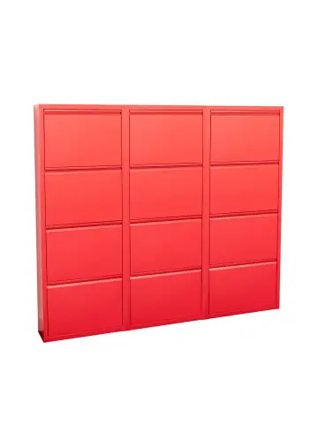 Schuhschrank Pisa mit 12 Türen in Metallrot. Komplett montiert wird ein Schuhschrank in der Farbe Rot geliefert, der sowohl Stil als auch Funktionalität in Ihr Zuhause bringt. Komplett montiert geliefert. RAL 3020 rot. Schublade innen: B46/L29/T13 cm. Kann auf den Boden gestellt oder an die Wand gehängt werden. Einzeln verwendbar. Türen öffnen sich gleichzeitig. Dieses Produkt wurde mit viel Liebe zum Detail hergestellt, was sowohl Ästhetik als auch hohe Haltbarkeit gewährleistet. Bei der Gestaltung wurde sowohl auf Funktionalität als auch auf Stil geachtet, was es zur perfekten Wahl für jeden Raum in Ihrem Zuhause macht. Die verwendeten Materialien sind von hoher Qualität, was dem Produkt eine lange Lebensdauer verleiht und dafür sorgt, dass es dem täglichen Gebrauch standhält. Ob zur Aufbewahrung oder als dekorative Ergänzung, dieses Produkt wertet Ihre Einrichtung auf und bringt zusätzlichen Komfort und Eleganz in Ihr Zuhause.
