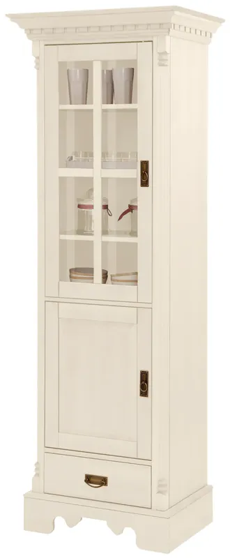 Vitrine im Landhaus-Stil aus FSC®-zertifiziertem Kiefernholz – rustikales Design mit Liebe zum Detail. 2-türige Vitrine, davon 1 Tür mit Glaseinsatz – ideal zur stilvollen Präsentation von Geschirr oder Deko. Geräumige Schublade– perfekt zur Aufbewahrung von Wohnaccessoires oder Küchenutensilien. Dekorative Fräsungen und aufwendige Details machen diese Vitrine zum Hingucker in jedem Wohn- oder Esszimmer. Viel Stauraum dank Schublade und Fächern – ideal zur Aufbewahrung in Wohnzimmer, Esszimmer oder Küche.