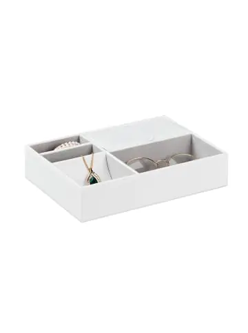 Mit diesem Schmuck-Organizer bewahrst Du Deine liebsten Schmuckstücke geordnet und übersichtlich auf. Das offene Design von 4 Fächern ermöglicht Dir direkten Überblick und Zugriff, während das Fach mit Deckel Deinen Schmuck vor Staub schützt. Dabei findet alles von Ringen bis zu Manschettenknöpfen seinen Platz. Der weiche Bezug des Schmuckbretts bietet dabei Schutz vor Kratzern. Das elegante Design in Lederoptik und der graue Innenbezug machen den Schmuckeinsatz zu einem stilvollen Hingucker.Schmuckkästchen im Detail – Maße H x B x T: ca. 5 x 25,5 x 18,5 cm – Gewicht: ca. 500 g – Material: MDF, Kunststoff, Baumwolle – In verschiedenen FarbenSchmuckaufbewahrung für Überblick – 2 kleine Fächer H x B x T: ca. 4,5 x 9 x 3,5 cm – Fach mit Abdeckung H x B x T: ca. 4 x 14,5 x 7,5 cm – Fach mit abgerundetem Boden H x B x T: ca. 4,5 x 9 x 9 cm – Offenes Fach H x B x T: ca. 4,5 x 15 x 9 cmEdler Schmuckeinsatz für Deinen Schmuck – Verschiedene Fächer zur übersichtlichen Schmuckaufbewahrung – Schmucktablett für Ohrringe, Halsketten, Armbänder, Uhren uvm. – Weicher Innenbezug des Schmuck-Organizers schützt vor Kratzern – Offenes Design für einfachen, schnellen Zugriff auf Schmuckstücke – Schmuck-Aufbewahrungssystem eignet sich auch für SchubladenLieferumfang – 1x Schmucktablett in ausgewählter Farbe – Dekoartikel sind nicht im Lieferumfang enthalten
