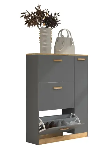 Highlight – Maße ca. H. 105 x B. 80 x T. 24 cm – 3 Fächer zum Aufklappen + 1 Drehtür- Für ca. 21 Paar Schuhe und StiefelDer Schuhschrank „Halom“ ist ein kleines Raumwunder mit viel Stauraum. Jedes der drei Fächer hat eine Fachunterteilung, damit Sie die Schuhe platzsparend und übersichtlich verstaut werden können. Hinter der Drehtür ist weiterer Stauraum für Stiefel oder Kleidung. Ein besonderes Highlight ist dem Designer mit dem Farbakzenten gelungen, womit sich die Griffe elegant absetzen und den Schuhschrank zu einem zeitlosen Blickfang machen. Der Schuhkipper kann mit weiteren Schuhregalen der Serie „VCM Halom“ kombiniert werden.VCM hat sich seit den 70er-Jahren auf die Konstruktion, Produktion und Vertrieb von Möbeln mit einem fairen Preis/Leistungsverhältnis spezialisiert und damit bereits Millionen Haushalte verschönert.- Schuhschrank für ca. 21 Paar Schuhe, Stiefel- Schuhregal mit praktischen 3 Klappen- Schuhkipper ca. H. 105 x B. 80 x T. 24 cm