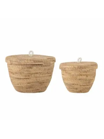 Mit Noi von Bloomingville erhältst du zwei handgefertigte Körbe in unterschiedlichen Größen. Dadurch und mit den dazu passenden Deckeln kannst du sie vielseitig einsetzen und sie verleihen ihrer Umgebung eine natürliche Atmosphäre. Von Kleinigkeiten bis hin zu Schals und Handschuhen findet alles Platz darin. Korb mit Deckel „Noi“ von Bloomingville Im praktischen 2er-Set Unterschiedliche Größen Platz für Kleinigkeiten, Schals & Co. Wasserhyazinthe 30 x 24 cm | 36 x 30 cm (ø x H)