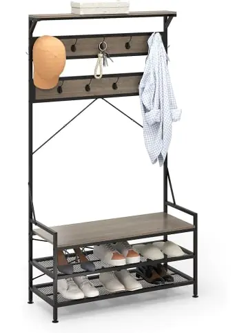 Beschreibung: Statten Sie Ihren Wohnbereich mit dem vielseitigen Garderobenständer aus, einer 4-in-1-Aufbewahrungslösung, die ein Ablagefach, eine Garderobe, eine Schuhbank und ein 2-stöckiges Schuhregal umfasst. Sein Design umfasst außerdem 11 Haken zum Aufhängen und bietet reichlich Stauraum für Ihre Alltagsgegenstände. Der robuste Metallrahmen kann bis zu 155 kg tragen und verfügt über verstellbare Fußpolster für Stabilität. Zwei Kippschutzvorrichtungen stellen sicher, dass der Garderobenständer aufrecht steht. Seine stilvolle Beschaffenheit wertet nicht nur Ihre Heimdekoration auf, sondern passt auch nahtlos in Eingangsbereiche, Wohnzimmer oder Schlafzimmer.Eigenschaften: Das obere Ablagefach ist perfekt für kleine Dekorationen Beinhaltet 11 Haken zum Aufbewahren von Hüten, Mänteln, Taschen usw. Kommt mit einer breite Schuhbank, um das Wechseln der Schuhe zu erleichtern Verfügt über ein 2-stufiges Schuhregal, das hilft, eine Vielzahl von Schuhen unterzubringen Sicherer Garderobenständer mit einer langlebigen, robusten Metallstruktur Zusätzliche Dreiecksrahmen und rückseitig verstärkte Rahmen für große Stabilität Verstellbare Fußpolster passen sich perfekt dem unebenen Boden an 2 Kippschutz-Sets verringern das Risiko eines versehentlichen Umkippens Praktische Handläufe helfen Ihnen beim Aufstehen von der Bank Bitte beachten Sie, dass die Garderobe zusammengebaut werden muss Material: Holzwerkstoff, Metall Gesamtmaße: 102 x 40 x 184 cm (L x B x H) Größe der oberen Ablage: 101,5 x 15 cm (L x B) Größe der Bank: 97,5 x 40 cm (L x B) Höhe der Bank: 48,5 cm Abstand zwischen den Ablagen: 16 cm Gesamttragfähigkeit: 155 kg Nettogewicht: 21,5 kgLieferungsumfang: 1 x Garderobenständer 1 x Handbuch