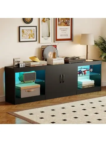 Beschreibung: Dieser unglaublich vielseitige modulare TV-Ständer passt sich nicht nur Ihrem Raum an, sondern begeistert auch mit einer fernbedienbaren LED-Beleuchtung mit 16 lebhaften Farben und 4 dynamischen Modi. Perfekt, um Kinoatmosphäre zu schaffen oder Ihrem Raum einen Farbtupfer hinzuzufügen. Er unterstützt Fernseher bis zu 85″ und hält Ihre Geräte mit 2 verstellbaren Regalen und einem geräumigen Mittelschrank organisiert. Gefertigt aus hochwertigem Sicherheitsglas und mit sanft schließenden Scharnieren versehen, verbindet dieses Entertainment-Zentrum Luxus mit Funktionalität.Eigenschaften: Individuell anpassbare LED-Lichtshow mit 16 statischen Farben und 4 Modi 10 dimmbare Helligkeitsstufen und 10 Geschwindigkeitsstufen für den Blitzlichtmodus Fernbedienung für bequeme Bedienung vom Sofa aus Reichlich Stauraum, um Ihren Entertainment-Bereich ordentlich und sauber zu halten 5-fach verstellbare Glasregale für individuellen Stauraum Geräumiger Schrank mit Regalen zur effektiven Versteckung von Unordnung Bequeme Griffe und sanft schließende Metallscharniere für einfache Nutzung Rutschfeste Fußpads für mehr Stabilität und zum Schutz des Bodens Material: Holzwerkstoff, MDF, Sicherheitsglas Gesamtmaße: 195 x 30 x 55 cm (L x B x H) Maße Schrankfach: 62 x 26,5 x 17 cm (B x T x H) Maße Glasregal: 62 x 29 cm (B x T) Abstand der verstellbaren Positionen: 3 cm Höhe Seitenfach: 41 cm Tragfähigkeit Tischplatte: 50 kg Tragfähigkeit Regal: 20 kg Nettogewicht: 31 kgLieferungsumfang: 1 x 3-teiliges modularer TV-Ständer 1 x Fernbedienung 1 x Bedienungsanleitung